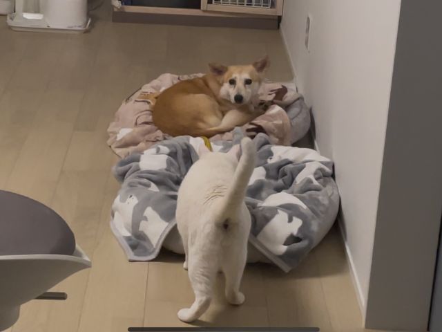 朝起きたらしっぽを振って大喜び!……ということはなく、しっぽは項垂れ、いつでも逃げ出せるように後退しながらこちらを見ています。
