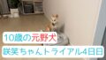 朝起きたらしっぽを振って大喜び!……ということはなく、しっぽは項垂れ、いつでも逃げ出せるように後退しながらこちらを見ています。