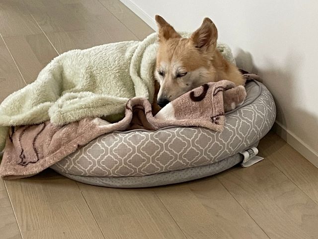 まず、さえちゃんがベッドやクレートの中など安心できる場所で伏せをしているときは、基本的に呼んでも来てくれません。