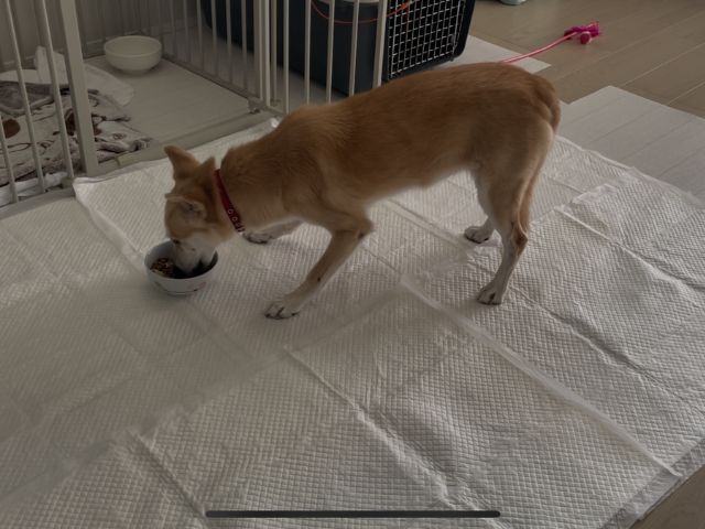 今日はサークルから出るのを少し嫌がり、出てもらおうとしている最中にサークル内でおしっこを失敗してしまいました…。